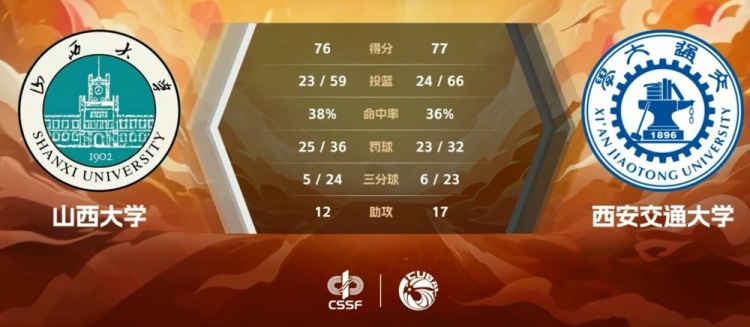 末节决战,乃达木造成三分犯规三罚全中,曹晋昌压哨打成2+1,王俊连续杀伤稳住局势,还造成吕涛犯满离场,马奥康连中两球顽强咬住,双方争夺陷入白热化,乃达木三分反超,西安交大连得5分强势回应,关键时刻双方对飙三分,王天宇绝命封盖帮助西安交大77-76险胜山西大学,挺进决赛。