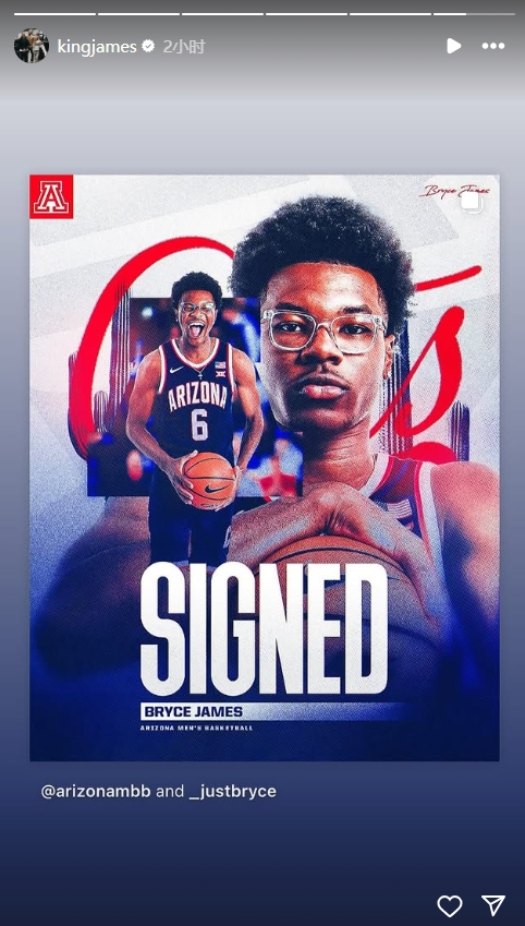 04月18日讯 今日,亚利桑那大学官宣签下湖人球星詹姆斯的二儿子布莱斯。詹姆斯在个人社媒转发了这一消息。