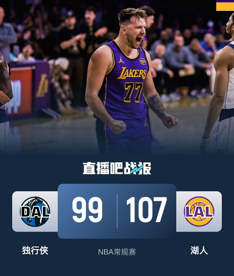 比赛开始,湖人率先发力打出9-2开局,欧文和东契奇接连外线对飚,随后里夫斯和八村塁又是接连三分命中,首节湖人领先8分,次节双方展开拉锯战,里夫斯接连三分单节得分上双,东契奇接连送助攻一度拉开16分领先,但湖人收内线策略效果不佳,克里斯蒂接连三分助独行侠半场追到差8分。下半场,双方展开拉锯战,湖人外线多个机会把握不住,欧文连砍7分继续带队追分,埃克萨姆接连中远投砍下5分追到差1分,末节克莱连续3记三分追平比分,东契奇上场和一攻一传助队稳住局势,欧文三分再追,但芬尼-史密斯和詹姆斯接连送补扣,湖人牢牢掌握住两球以上领先,最终湖人107-99力克独行侠,拿到3连胜。