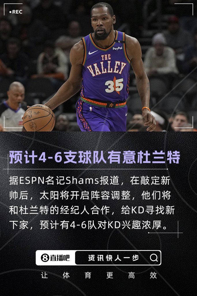 数位消息人士表示,今年休赛期,预计今年休赛期杜兰特会有强劲的市场,将有约4到6支球队对交易得到他有浓厚的兴趣。