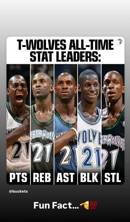 据统计,在NBA各队历史上,只有森林狼由加内特一人包揽得分、篮板、助攻、抢断和盖帽五项主要数据的队史第一。