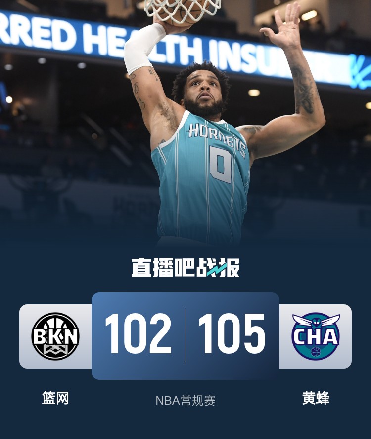 比赛开始,篮网率先发力,托马斯里突外投连砍7分建立领先,迪亚巴特内线连续打成止血,双方拉锯战,小桥三分助黄蜂首节追到差2分,次节黄蜂半节仅得4分,篮网依靠替补不错发挥顺势领先到双位数,随后小桥止血回应,半场篮网领先15分。下半场,双方命中率都有提升,尼克-史密斯接连三分追分,篮网全民皆兵回应,双方围绕着10分左右分差展开拉锯战,末节拉塞尔先连续2+1,再接连三分连砍15分助队重新拉开比分,但黄蜂外线也能回应,篮网最后4分钟断电后迪亚巴特补篮反超比分,小桥关键封盖,最终黄蜂105-102逆转篮网,终止9连败同时送对手7连败。