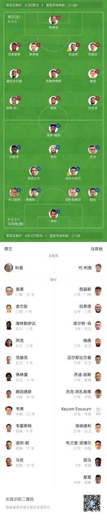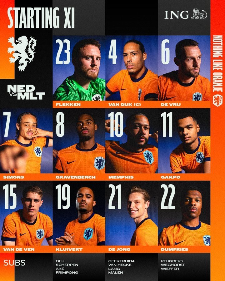 06月11日讯 世预赛欧洲区小组赛G组第4轮,荷兰主场迎战马耳他,赛前首发名单公布。