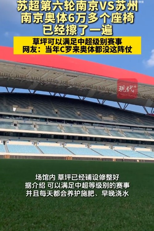 7月5日,苏超第六轮,南京队将在奥体主场迎战苏州队。7月2日,现代快报记者实地探访发现,除了在奥体东门摆放了3个足球,场馆外的草坪修剪了,喷泉水池也换了水。场馆内,比赛场地已就位,草坪已经铺设修整好,据介绍,草坪可以满足中超等级别的赛事,并且现在每天都会养护施肥、早晚浇水,让草长得更好。在观众席,工作人员正在做进一步的清扫,地面扫过一遍之后再拖一遍;6万多个座椅也已经擦了一遍,一直到赛前都会进行保洁。