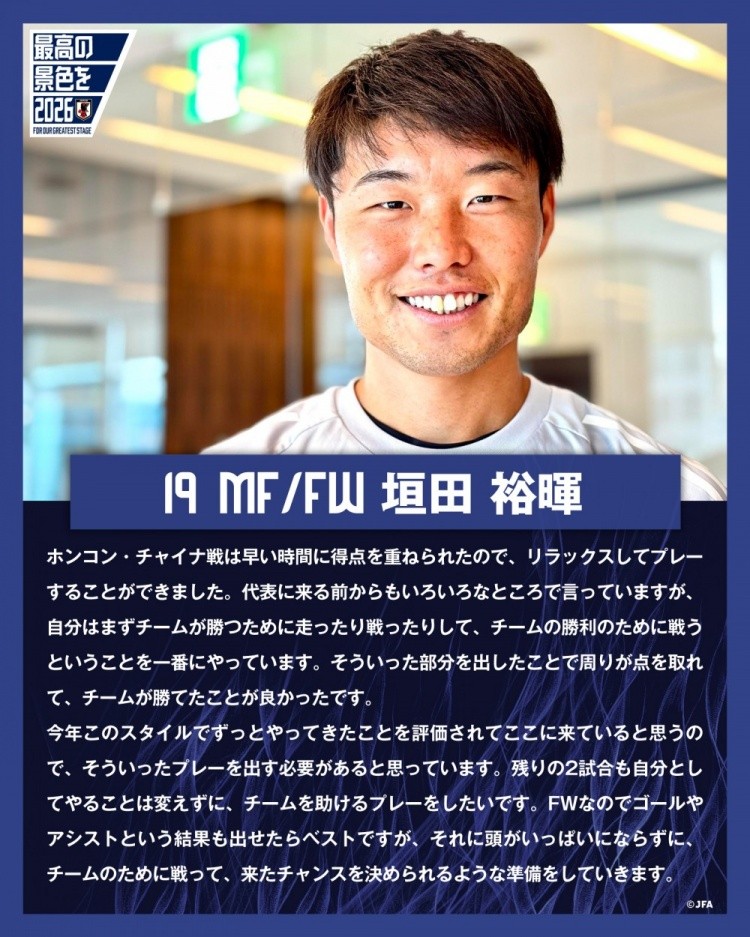 垣田裕晖表示:“与中国香港队的比赛我们早早取得了进球,进球后球队也能够以放松的心态进行比赛。在来到国家队前自己也谈到了一些内容,但首先还是要为了取胜在场上全力奔跑、与对手全力周旋,毕竟球队的胜利是最重要的。通过自己的表现能够帮助周围的队友取得进球,进而帮助球队取胜,这是很好的。”