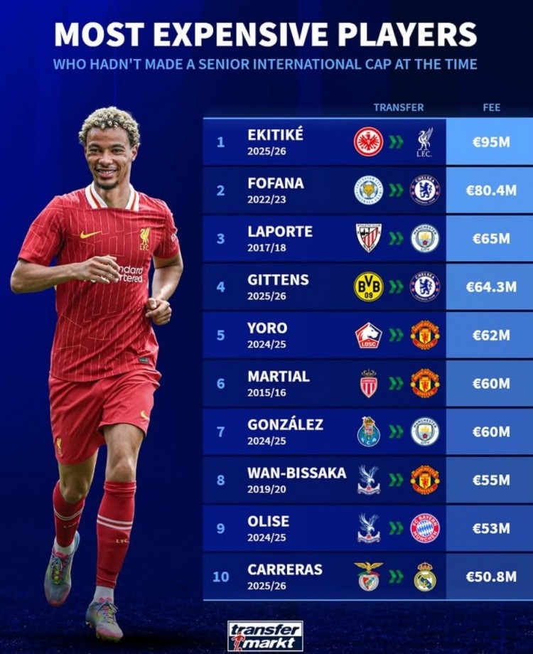 7月28日讯 利物浦在上周已经官宣以9500万欧元签下埃基蒂克,而他至今尚未为法国队出战。《转会市场》也统计了那些在加盟时仍未能为成年国家队出场的历史最贵引援。