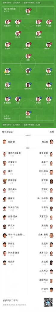 纽卡首发:22-波普、2-特里皮尔、5-沙尔、7-乔林顿、10-戈登、11-巴恩斯、13-塔格特、23-墨菲、33-伯恩、39-吉马良斯、67-麦利