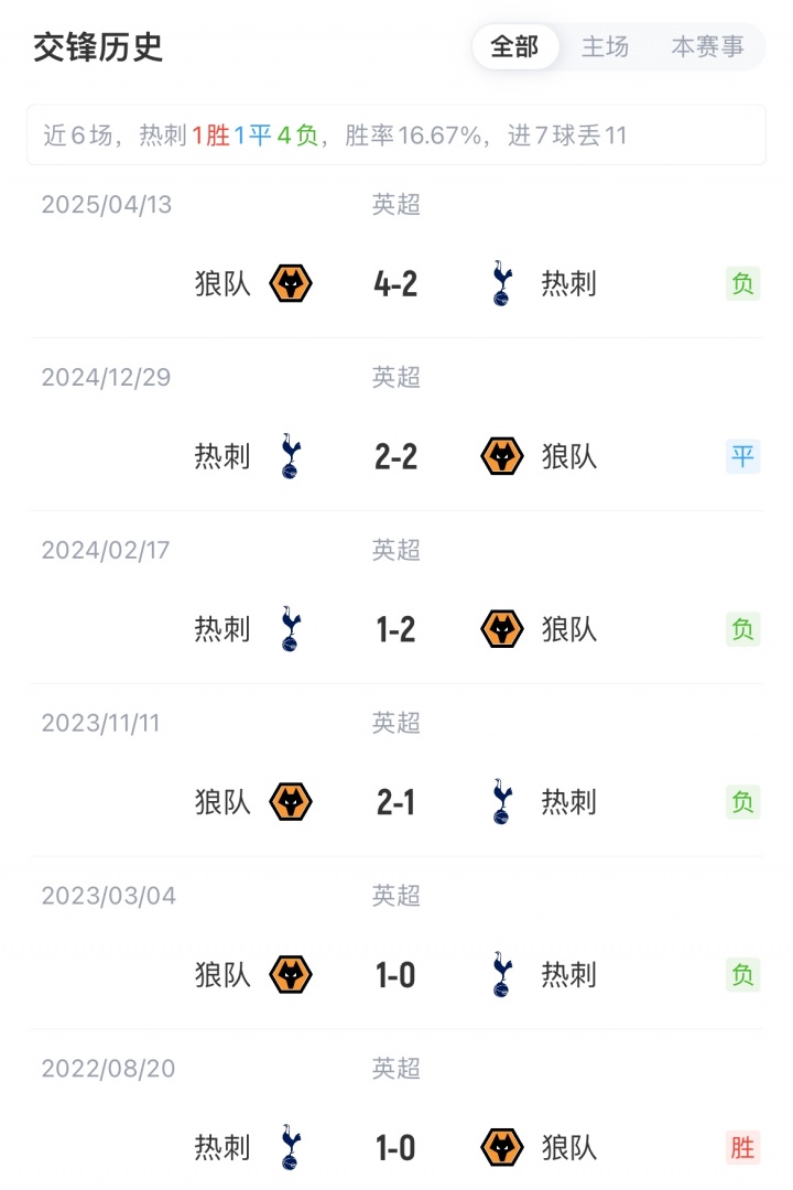 积分榜方面,热刺3胜1平1负积10分,近4场不败;狼队开季5轮连败目前垫底。历史交锋热刺对阵狼队近5场不胜(1平4负)。
